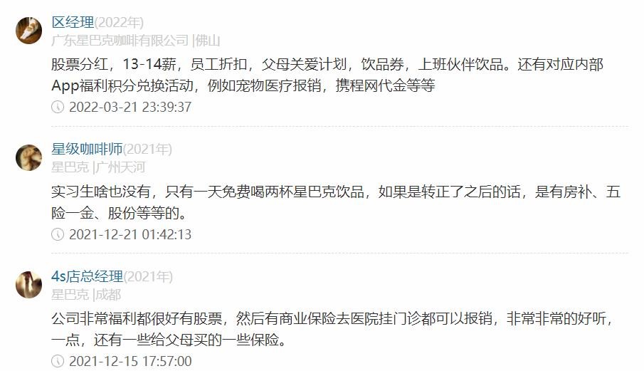 员工2:实习生啥也没有,只有一天免费喝两杯星巴克饮品,如果是转正了之后的话,是有房补、五险一金、股份等等的。