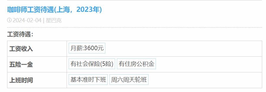1、星级咖啡师,工资收入3500元,年终奖多发一个月工资,五险一金都有,基本准时下班,周末需要轮班。