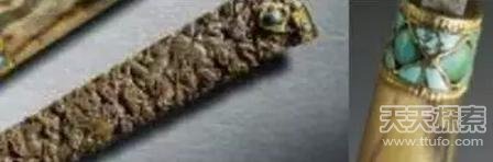 武器的刀鞘由犀牛角制成,呈尖形六三爪龙扭动。刀由金制成,鞘中镶嵌有绿松石,珊瑚,琉璃和,专家认为,这种刀确实属于乾隆皇帝。在2009年它在苏富比售出了962万港币。
