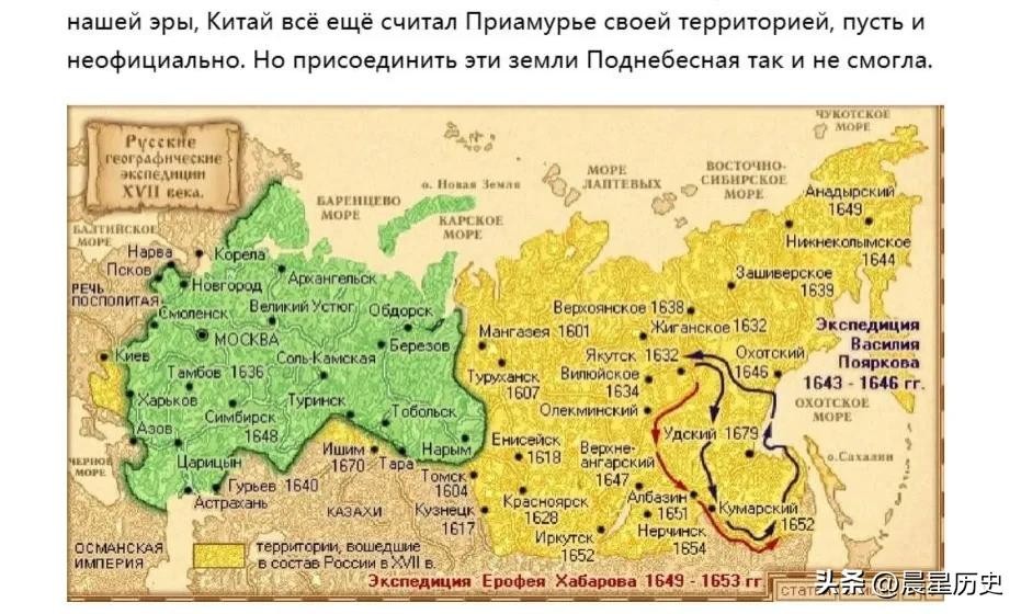 第五,17世纪中叶俄国人已经占领了几乎整个西伯利亚,还拓展到了黑龙江流域,中国此时正处于明清改朝换代之际,正忙于内部的权利争夺,无暇顾及西伯利亚。等到清朝建立试图向西伯利亚开疆拓土的时候,雅克萨之战使清朝见识到了俄国人武器的厉害,所以1689年两国缔结尼布楚条约后,他们再也没有提出西伯利亚的领土主张。