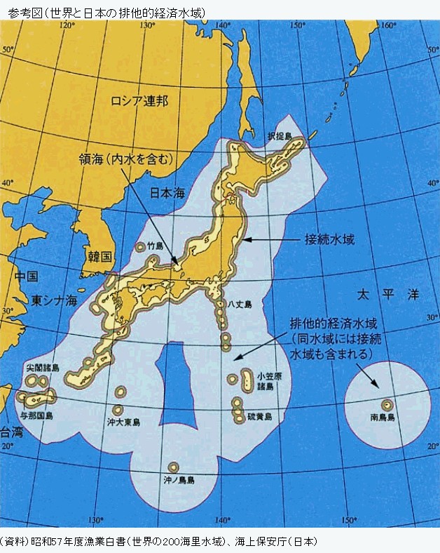 可是还有另一个很多中国人不知道的日本地图----日本经济海域图。所谓经济海域,即所属国家具有对之资源等的开发权。也就是说下图中浅白色区域的大部分(这里包括和中韩俄的争议区域所以说大部分),是日本可以独占进行经济开发活动的。这些海域的面积有多少呢?447万km2---日本国土面积的12倍!世界上排名第六!