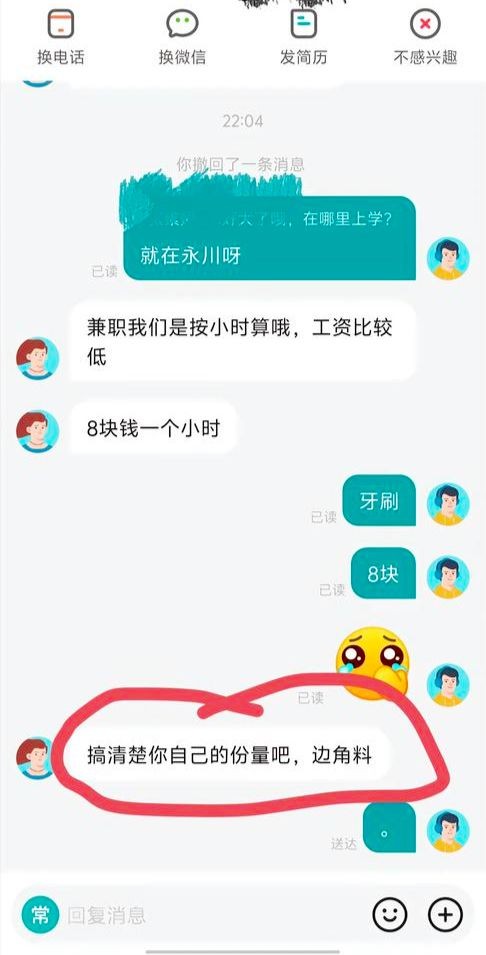 在与奶茶店工作人员沟通后,小铭得知奶茶店的兼职工资是每小时8元,他当时回复“牙刷(重庆方言,表示不满的意味),8块”,奶茶店工作人员对此回应“搞清楚你自己的分量吧,边角料”。