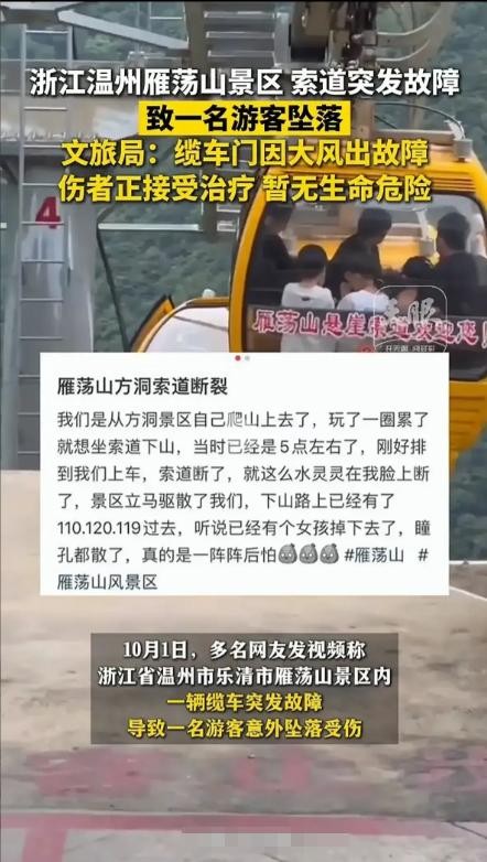 秋天本该是出去玩的绝佳时机,可谁料,微信朋友圈里的山清水秀和美食盛宴背后,却传来了一个令人揪心的消息——浙江温州的一个景区发生了惊心动魄的索道断裂事故,一名女游客悲剧坠落,生死未知。这一消息迅速在网络上引发热议,人们在震惊和担忧中,急切关注事故的详细情况和安全问题的深层次原因。