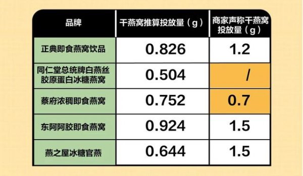 除了蔡府达到声称的燕窝添加量,东阿阿胶、正典和燕之屋推算结果分别只有0.924g、0.826g和0.644g,均未达到声称的1.5g、1.5g和1.2g的投放量。
