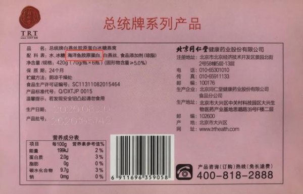 尽管同仁堂的蛋白质含量在数据上比较突出,但在产品配料表中明确标识添加了海洋鱼胶原蛋白,且成分排序位于燕窝原料之前,一定程度补充了产品中的蛋白质含量,换言之,同仁堂该款即食燕窝里的蛋白质不完全来自于燕窝。