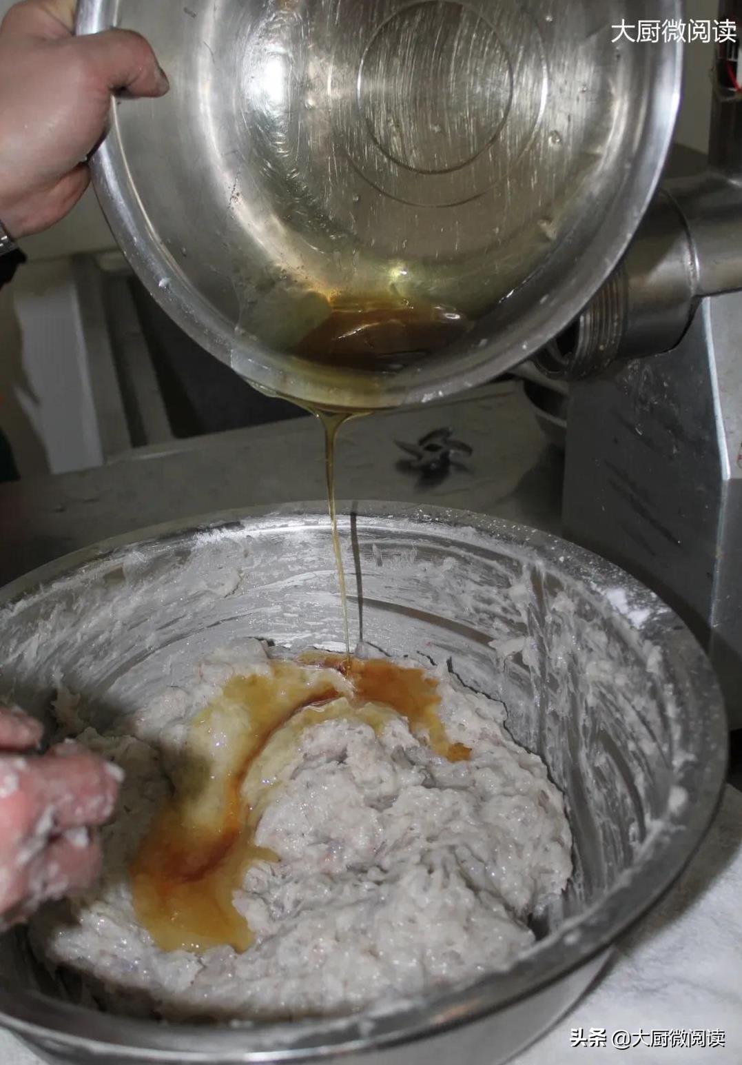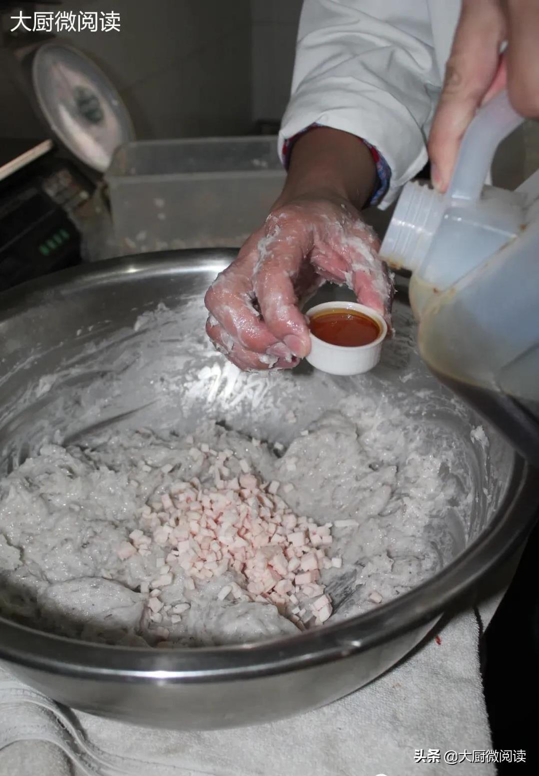制作流程:1.青虾5000克在细流水下冲1小时,捞出沥干,放适量淀粉拌匀静置30分钟,再以细流水冲洗干净,用布吸干水分,均匀分成两份:一份用刀背剁出胶质,然后用刀尖粗斩几下(这样斩出的虾胶中还包裹着颗粒状的虾仁);另一份则放入机器,绞成虾蓉。