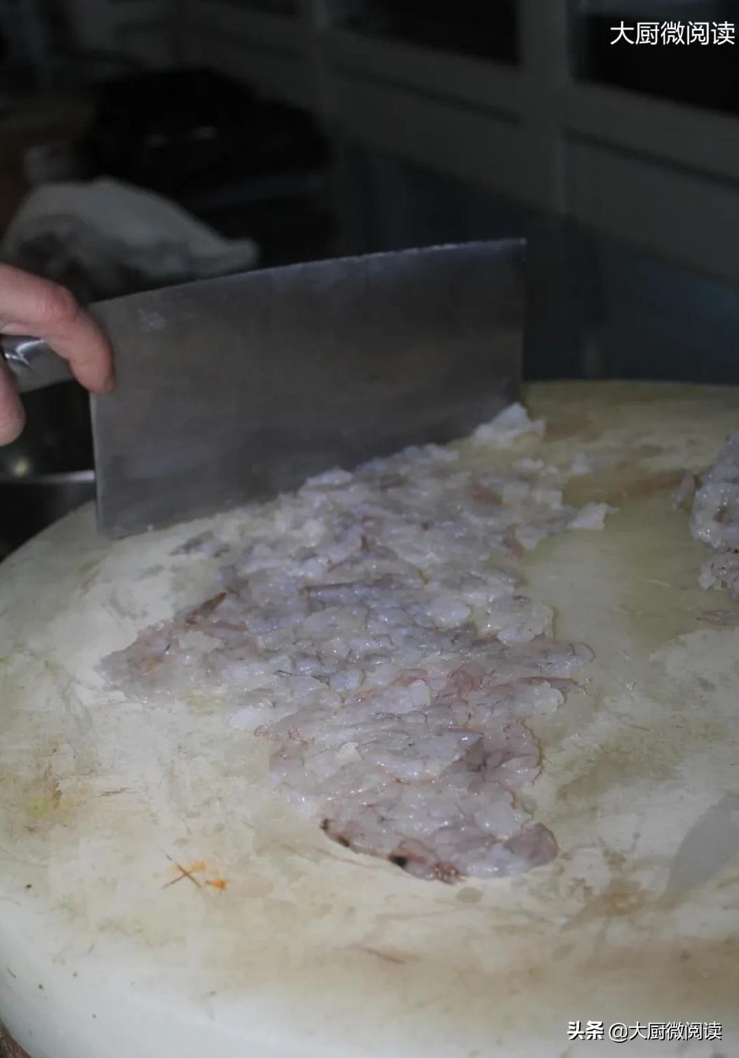 2.取一份虾仁粗剁三刀,然后用刀面抹平,继续粗剁几下备用。