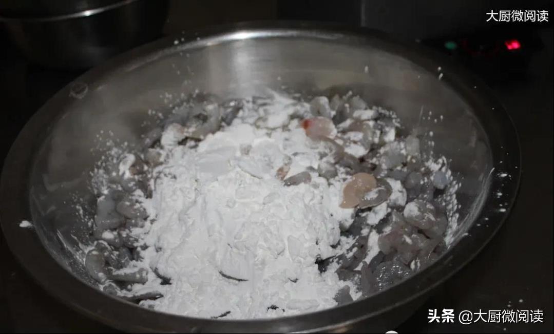 1.成板的青虾仁750克用细流水冲1小时,捞出控水,下淀粉150克轻轻拌匀,静置30分钟,然后冲净,捞出吸干水分备用。