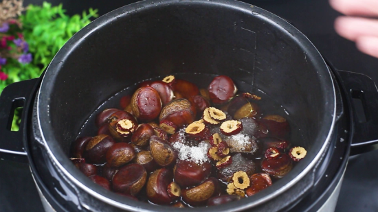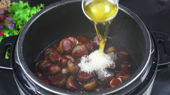 我们可以在里面加入一些白糖或者是冰糖,根据自己对甜味的味觉,决定放多少白糖,还要加一勺食用油,因为放了油的板栗,在剥的时候就不存在会粘连在一起,有的时候吃生板栗会发现板栗上面有一层板栗皮,特别难剥,所以放了油之后就不存在有这种感觉了,而且这样的板栗煮出来也非常的好吃。