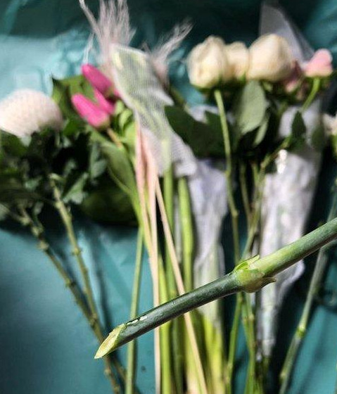 6、修剪花枝。以斜45度角减去2-3厘米为宜。(这样花茎入水后才能更大面积吸收水)