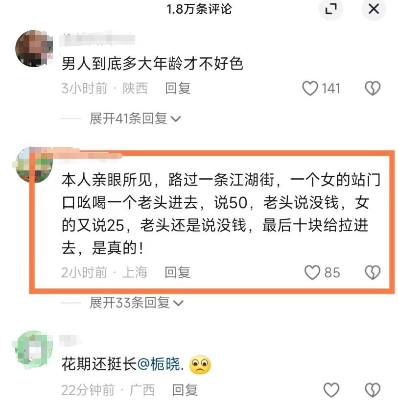本人亲眼所见,路过一条江湖街,一个女的站门口吆喝一个老头进去,说50,老头说没钱,女的又说25,老头还是说没钱,最后十块给拉进去,是真的