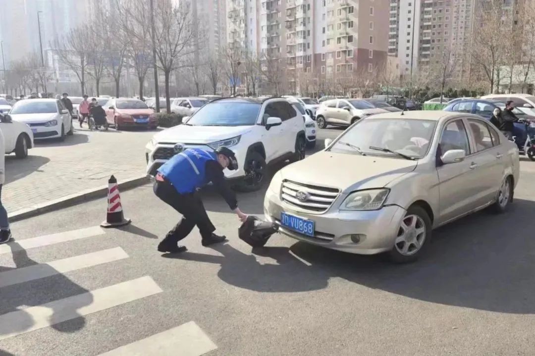 一位司机因大意撞上了隔离墩,导致隔离墩卡在了车底,执法队员主动上前帮忙解围,赢得路人点赞。