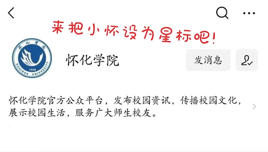 亲爱的读者们,近期微信公众号改版,订阅号消息不再按时间排序,为了方便您能够继续阅览我们的文章,希望您可以在文章底部点击“在看”或者为“怀化学院”公众号设置“星标”(点击公众号界面右上角三个点——设置星标即可),让系统知晓“怀化学院”是您常看的公众号,这样您以后就可以第一时间关注到我们的消息啦!