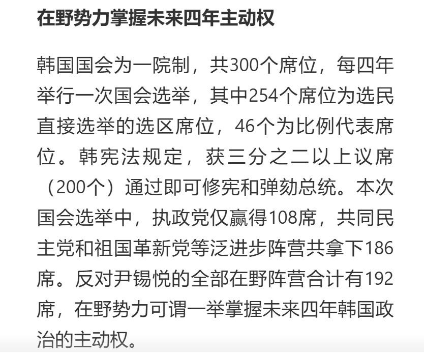 尹锡悦的决定源自一场关于国内政治斗争的升温,2024年,第22届韩国国会举行了为期四年的选举,最大在野党共同民主党成功地扩大了议席,进一步增强了他们在国会的掌控力,尹锡悦和他的执政党因此面临前所未有的困境。