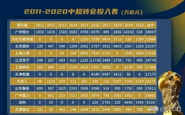 2011—2020十年间,所有俱乐部内外援转会金额总计:22亿欧元折合人民币158亿