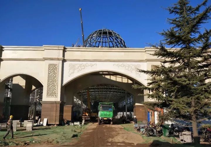 园区大门已具雏形,干挂大理石已完成。