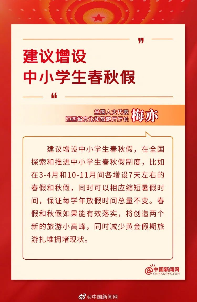近日媒体报道,今年两会上,全国人大代表、江西省文化和旅游厅厅长梅亦建议,增设中小学生春秋假,在全国范围内探索和推进中小学生春秋假制度。