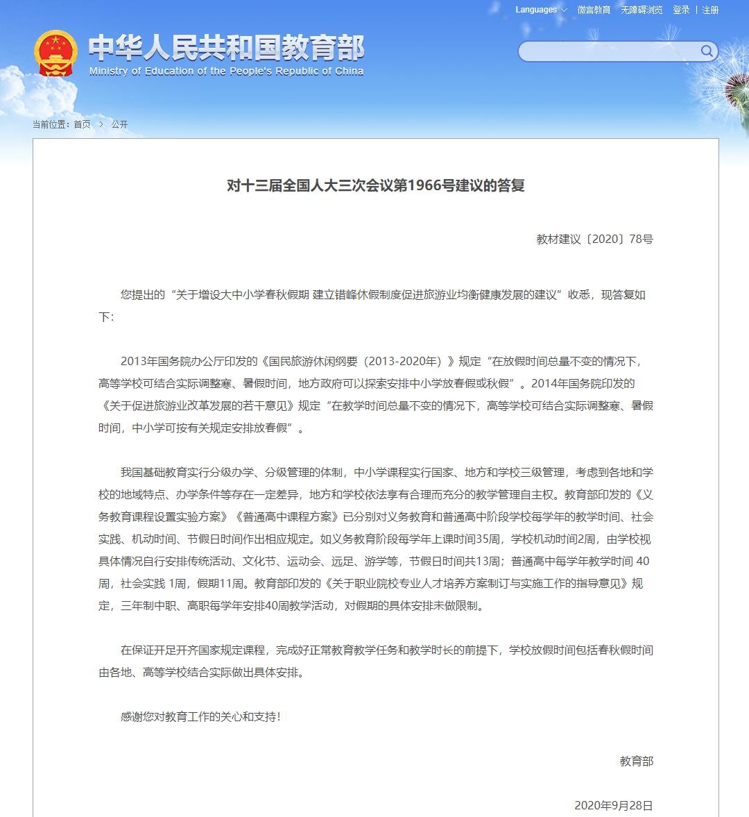 2020年10月,教育部答复称,在保证开足开齐国家规定课程、完成好正常教育教学任务和教学时长的前提下,学校放假时间包括春秋假时间由各地、高等学校结合实际做出具体安排。