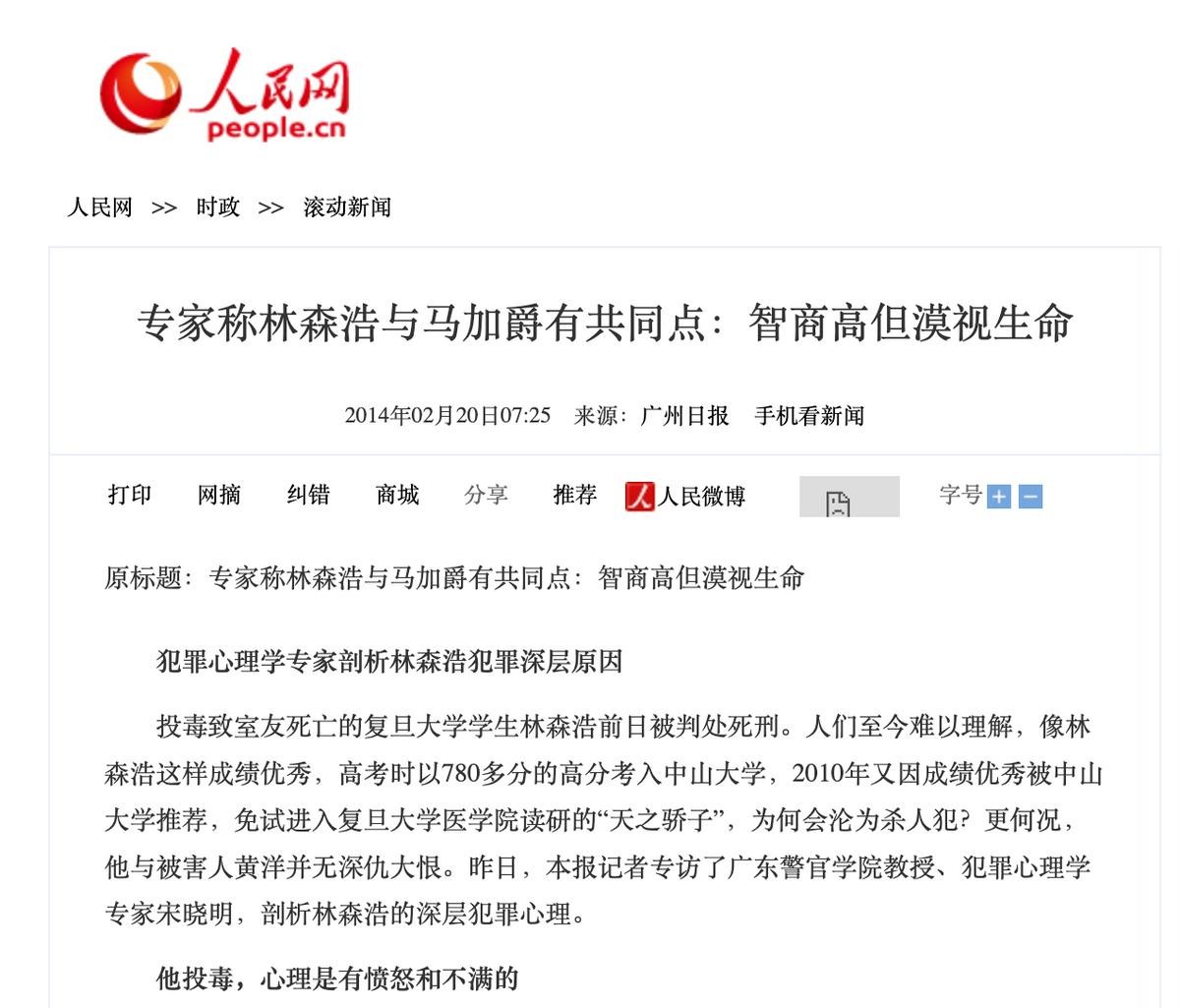 专家称林森浩与马加爵有共同点:智商高但漠视生命