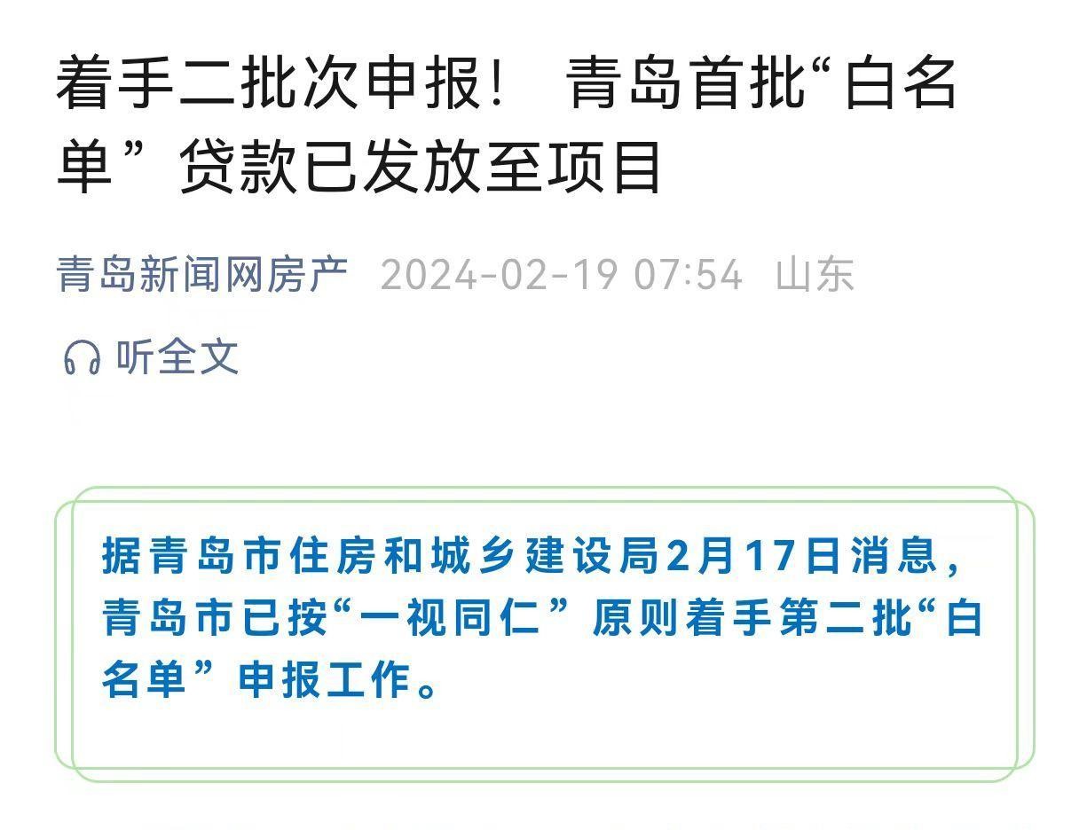 具体到青岛,目前青岛首批“白名单”贷款已发放至项目,正着手二批次申报!