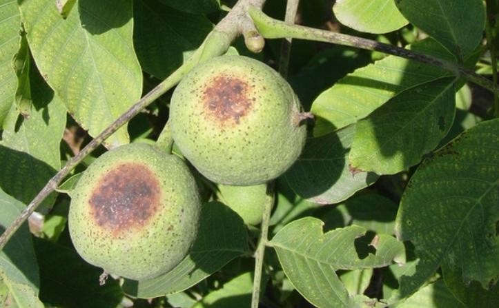 果实、树干易受害。果实向阳面现灼伤斑,初期褪绿发白,后变褐色干疤;树干日灼表现为树皮局部变白、干枯、开裂。因高温季节强光直射,植物局部温度过高致组织受损。