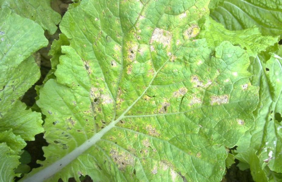 多发生在十字花科蔬菜及葡萄上。发病时叶片正面有不规则黄斑,叶背长灰白色至紫黑色霜霉层,病情发展快,会让叶片干枯,影响生长和产量。病原菌在病残体或种子存活,低温高湿、昼夜温差大时易流行。