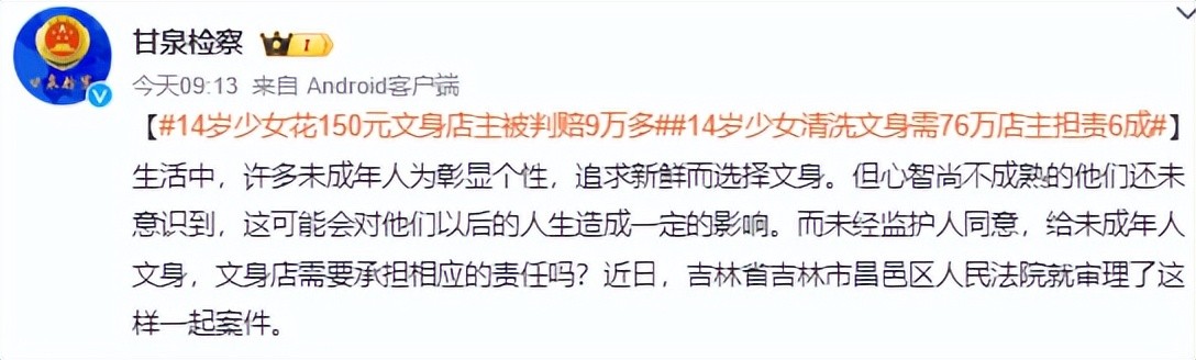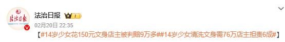 信息来源:“法制日报社官方微博”——(【#14岁少女花150元文身店主被判赔9万多##14岁少女清洗文身需76万店主担责6成)