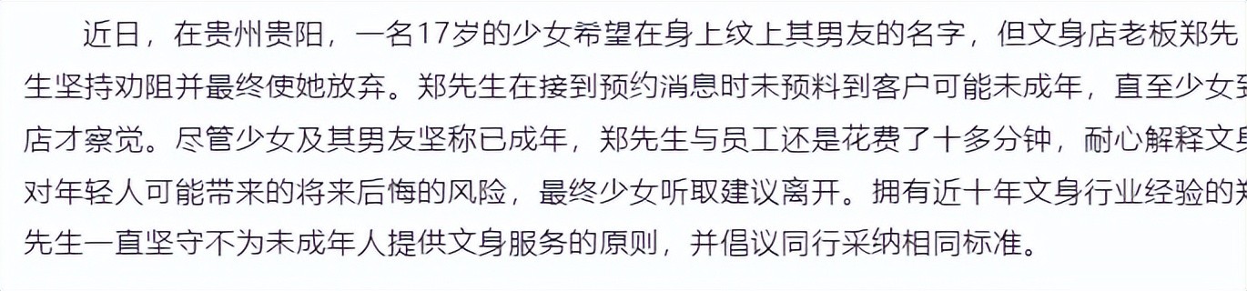 在2024年,刘老板就遇到了相似的事情,当时17岁的少女希望在身上纹上男友的名字,当时老板的察觉少女可能没成年,就进行劝解并要对方出示身份证。
