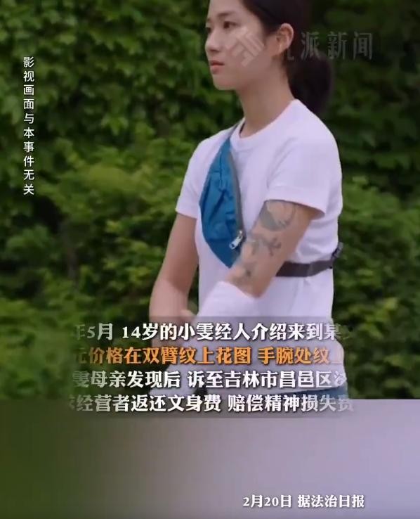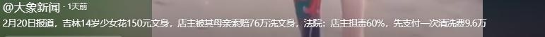 信息来源:“河南广播电视台大象新闻官方抖音号”——(2月20日报道,吉林14岁少女花150元文身,店主被其母亲索赔76万洗文身,法院:店主担责60%,先支付一次清洗费9.6万。)