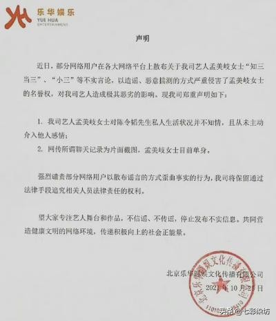 当前早些时候,孟美岐公司发布声明,表示孟美岐对陈令韬的私人感情生活并不知情,未主动介入他人感情,并强调孟美岐目前是单身。