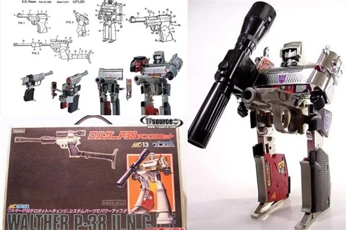 如今被自媒体戏称为“买个床(Megatron)”的威震天,其“枪威”版也是先有玩具,后有动画片人物。前身来自于microman的microchange(以下简称mc)系列第12、13号玩具,简称MC12/13。其中mc13的名字,也就是瓦尔特P38 u.n.c.l.e版。g1动画片中的人物则是把脸拉长些,变得不像玩具那么面部狰狞了。