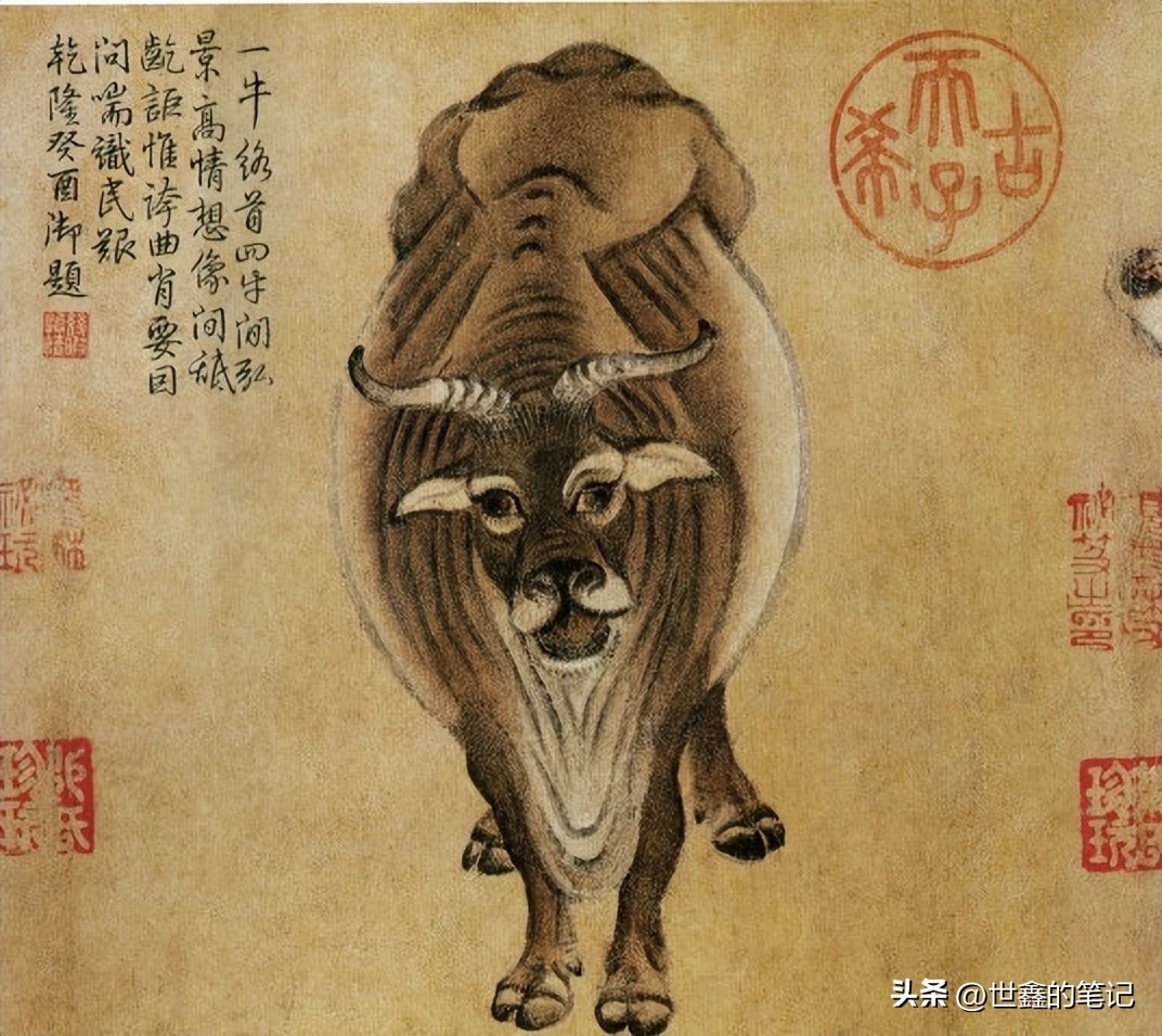 除此之外,《五牛图》还有一个身份,那就是我国存世年代最久远的纸质画。同样传承有序,有历代十四名家的鉴赏章记,在八国联军洗劫紫禁城时不知所踪。