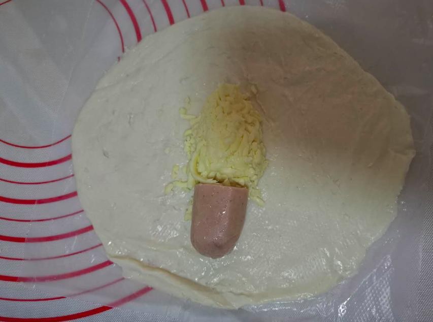 手抓饼、芝士提前放到室温下解冻,一根热狗一分为二,跟软化的芝士一起放在手抓饼中间,然后将手抓饼卷起来,收口,否则芝士会流出来。可以用一次性筷子把热油串起来,这样做好以后比较方便吃。