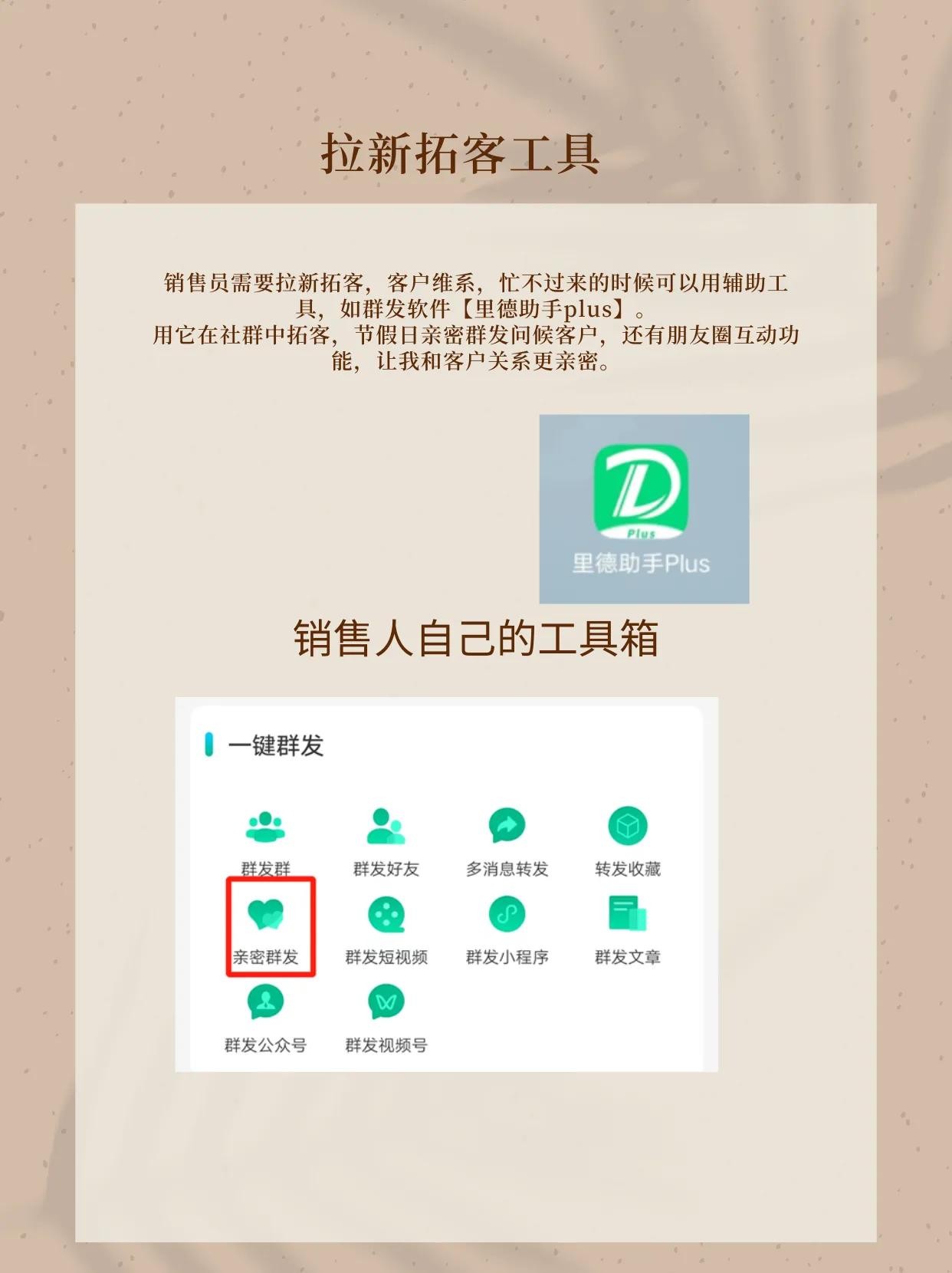 销售员需要拉新拓客,客户维系,忙不过来的时候可以用辅助工具,如群发软件【里德助手plus】。
