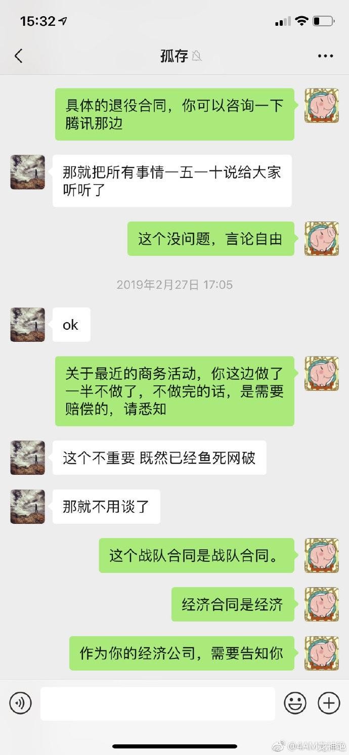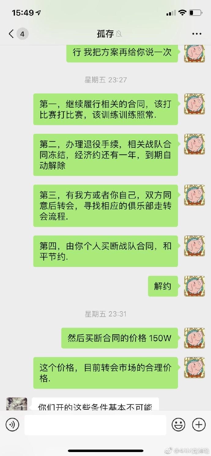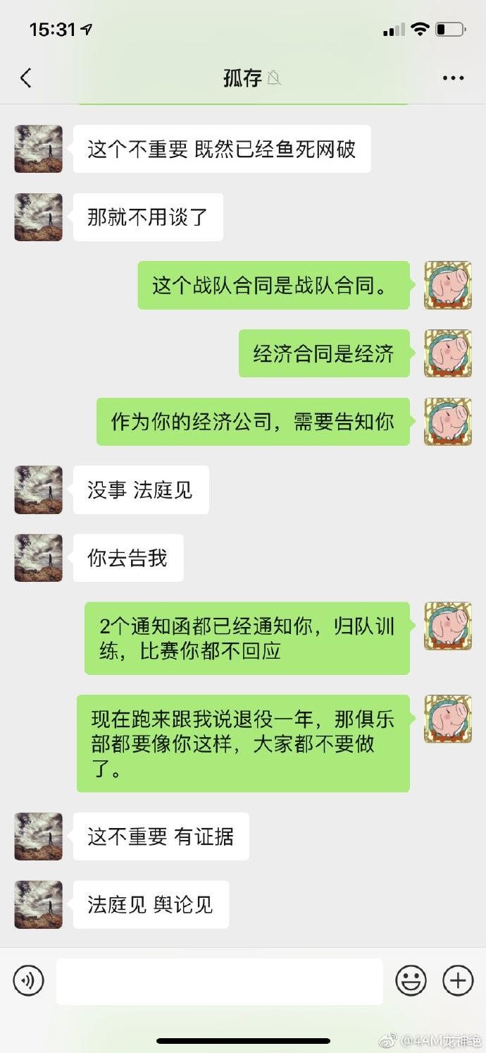 从聊天内容中可以得知,孤存和4AM 彻底谈崩了,不回俱乐部训练,鸽了商务广告活动,也不做出任何回应,孤存已经是违约的状态,对俱乐部造成了严重的影响。