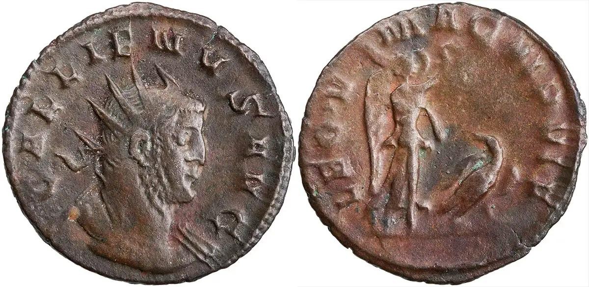 加利埃努斯皇帝的银币,显示胜利的化身,脚下有一只鹰,象征着第五马其顿军团,公元258年,私人收藏