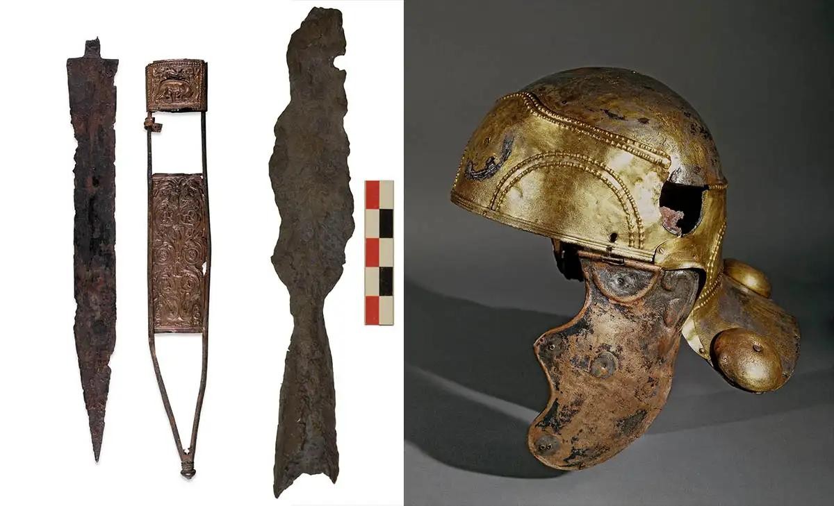 罗马青铜骑兵头盔,公元1世纪,通过大英博物馆;与富勒姆剑,公元1世纪初,通过大英博物馆;和铁矛头,公元1世纪,通过大英博物馆