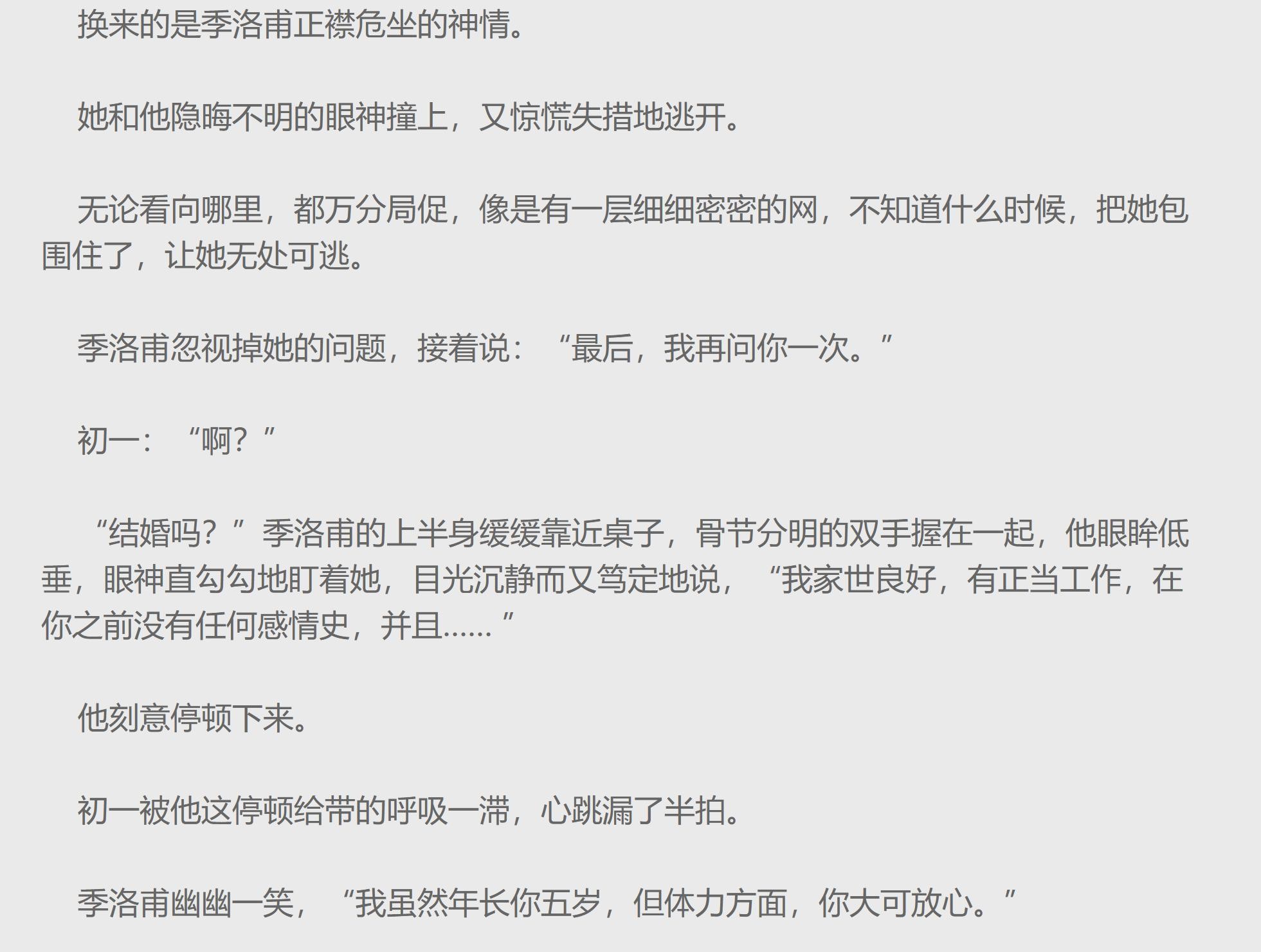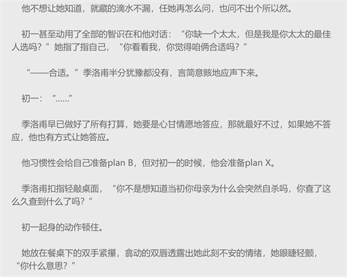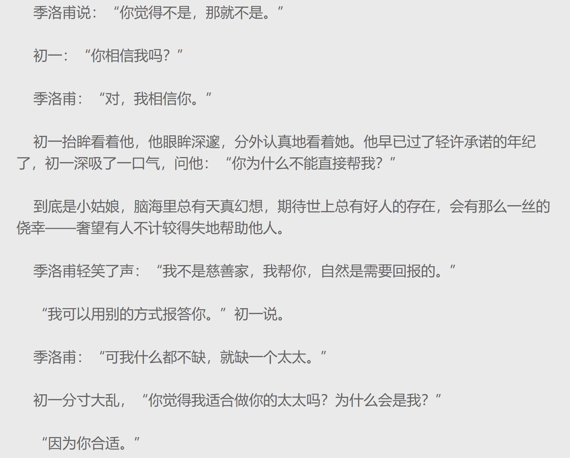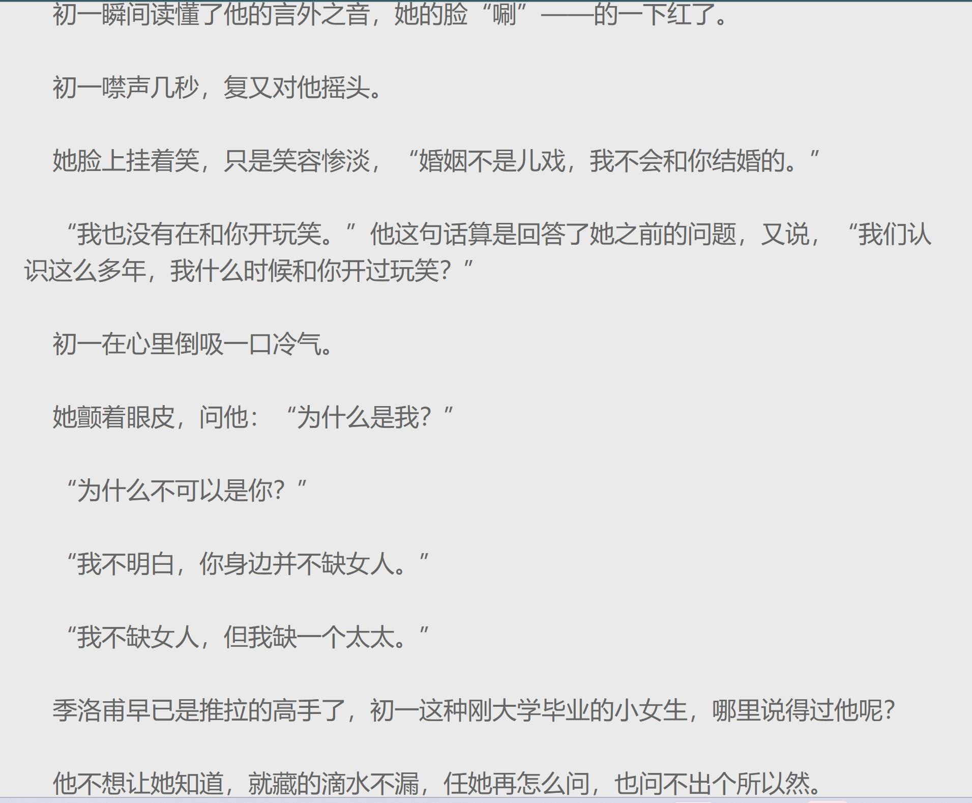 初一虽然心里惶惶不安,但面上保持着一贯的冷静泰然地坐在他家客厅里,初一说起昨晚的事情,想要当作一夜放纵,男欢女爱一场,谁都没吃亏。季洛甫坐姿端正,西装革履,神情松散又惬意,仿佛对初一势在必得。季洛甫提出结婚,初一不敢相信,季洛甫身世、样貌都不错,何必要和她结婚?但季洛甫说他缺一个太太。缺一个他一直爱着的太太,还未将爱宣之出口的太太。此时初一还未爱上季洛甫,但季洛甫对她已经布下了天罗地网,她想逃也逃不了。