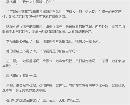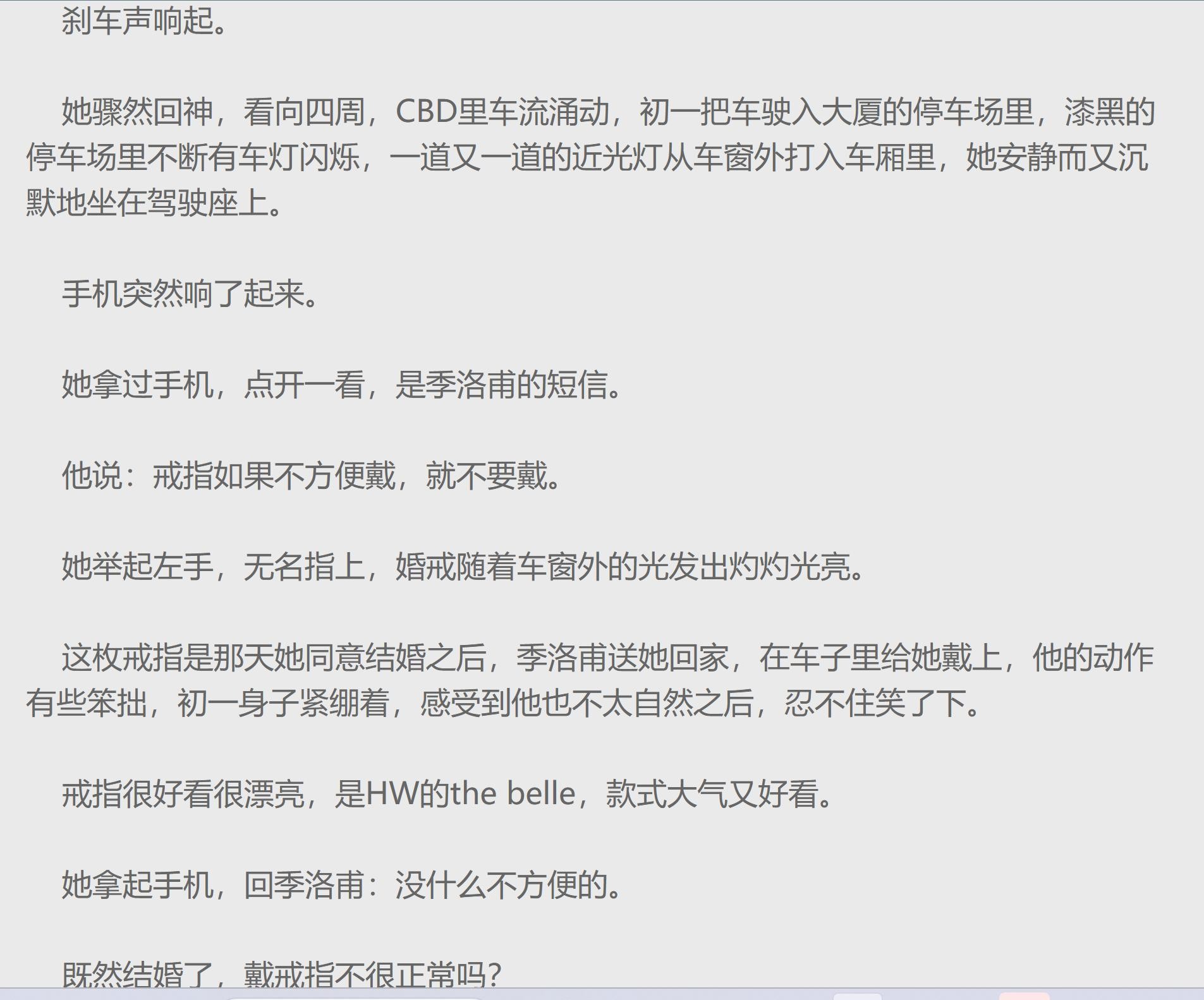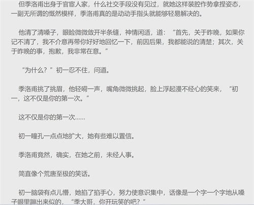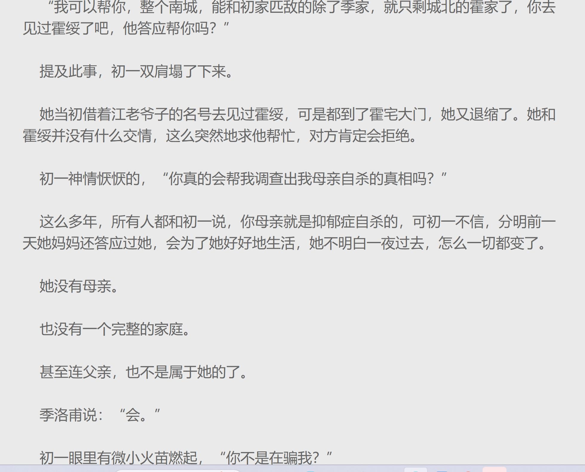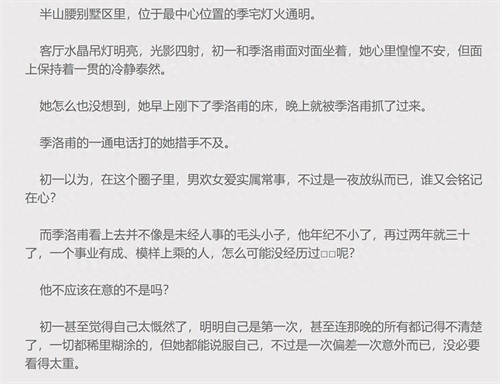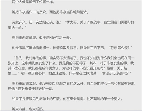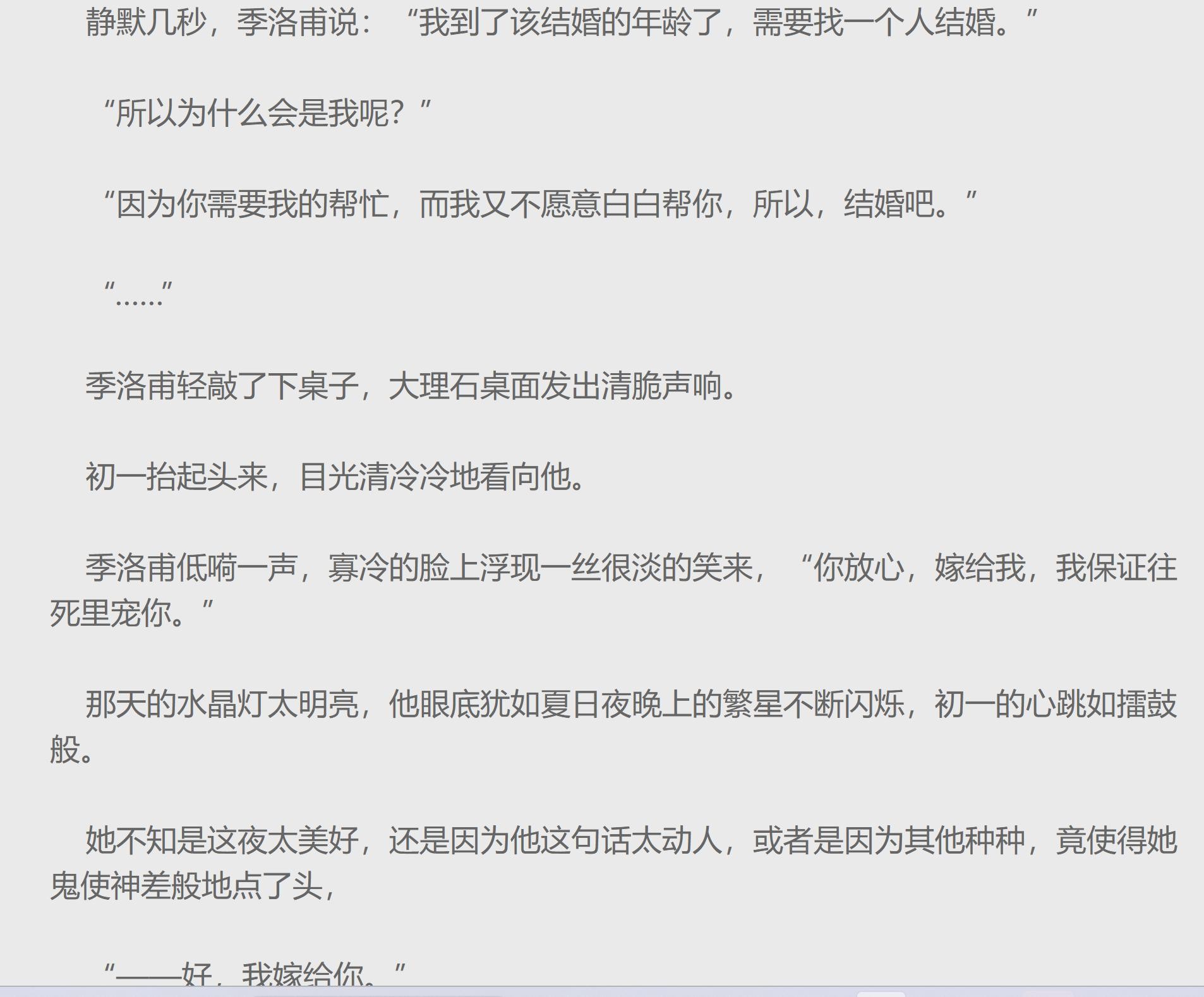 初一虽然心里惶惶不安,但面上保持着一贯的冷静泰然地坐在他家客厅里,初一说起昨晚的事情,想要当作一夜放纵,男欢女爱一场,谁都没吃亏。季洛甫坐姿端正,西装革履,神情松散又惬意,仿佛对初一势在必得。季洛甫提出结婚,初一不敢相信,季洛甫身世、样貌都不错,何必要和她结婚?但季洛甫说他缺一个太太。缺一个他一直爱着的太太,还未将爱宣之出口的太太。此时初一还未爱上季洛甫,但季洛甫对她已经布下了天罗地网,她想逃也逃不了。
