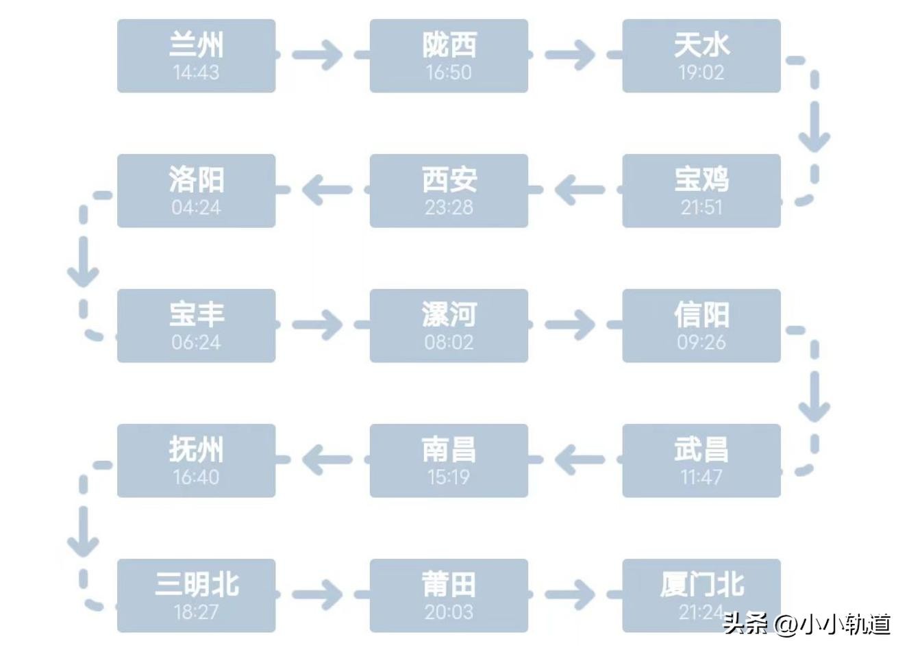 本次列车14:43从兰州出发,次日21:24到达厦门北,中间一共停靠13个站(详情见图),全程2599公里,运行时长30小时41分钟。其中,西安站停靠22分钟,武昌站停靠20分钟,南昌站停靠23分钟,莆田站停靠14分钟。