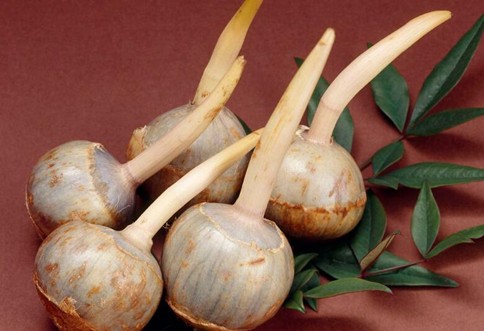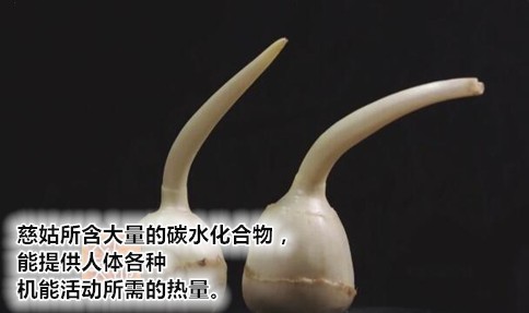 慈姑以球茎供人们作蔬菜食用,口感与土豆相似,稍带一点苦涩味,后甘甜。慈姑根茎的的尖端长有一个顶芽,长且粗壮,同时向一边弯曲,形似逗号。