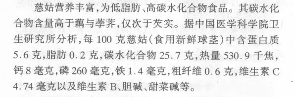 慈姑营养丰富,富含蛋白质、脂肪、淀粉、钙、磷、铁等人体所需要的多种微量元素。食用方法很多,可煮食、炒食,做成各式菜肴。因球茎中富含淀粉,也可制成淀粉食用。
