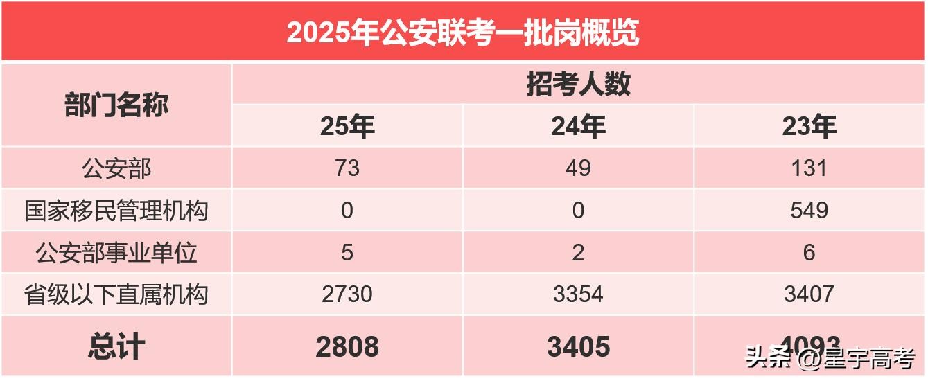 岗位概览:2025年公安联考一批岗总共2808人,2024年总共3405人,2023年总共4093人,2024年人数减少了688个,2025年在2024的基础上再减少了597个。近三年呈现逐年降低的趋势,主要是近两年国家移民管理机构未招录,另外公安部机构的人数有所增加,省级以下直属机构人数明显减少。