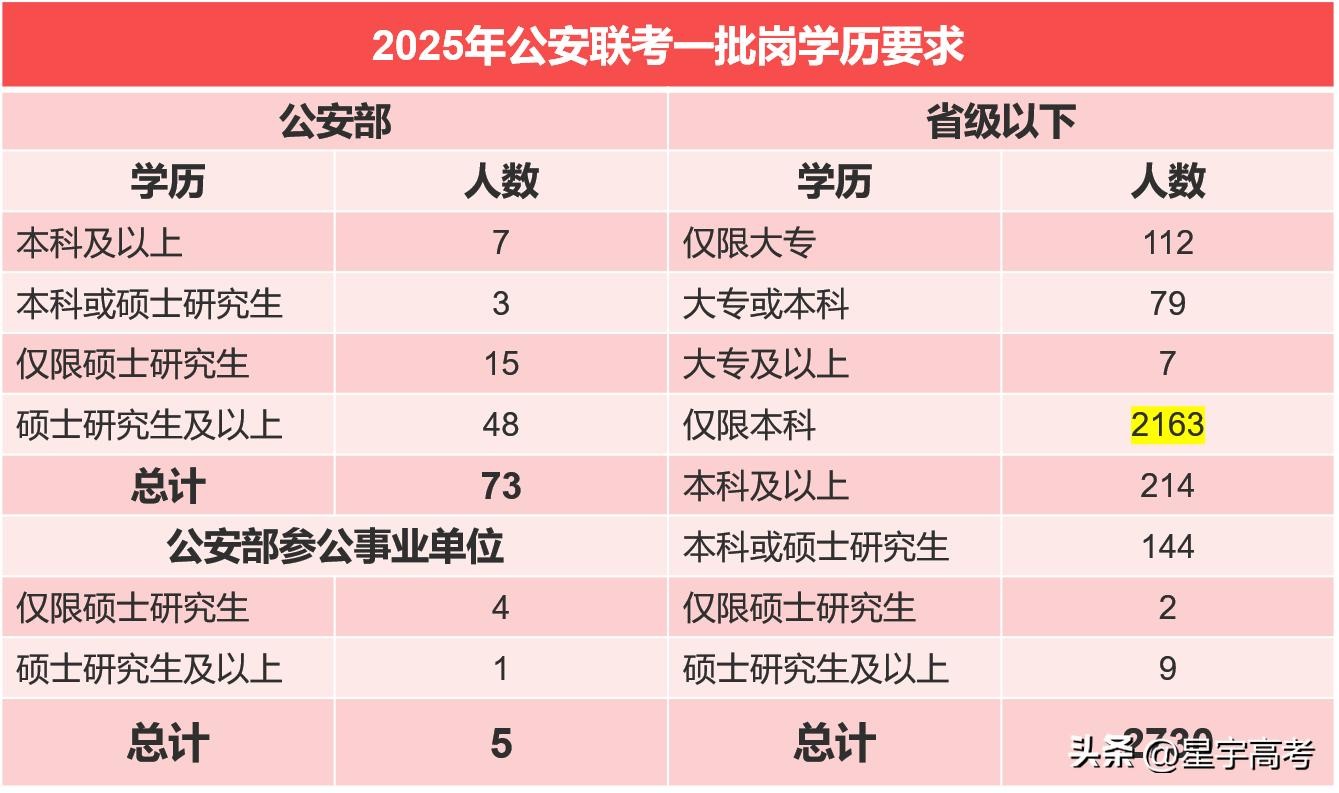 学历要求:2025年公安联考一批岗的学历要求,大部分还是集中在本科,而本科可报的大部分岗位集中在省级以下单位,这和公安联考文件中提到的面向基层就业相吻合。大专可报的岗位仅占7%,以铁路公安和西部或边远地区岗位为主。