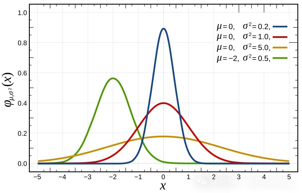 是正态分布的数学期望值,可解释为位置参数,决定了分布的位置,表示曲线中心在哪里;方差 为尺度参数,决定了分布的幅度,表示曲线的扁平情况。均值 和方差 不同,曲线形状也有所不同,如下图 7 所示:
