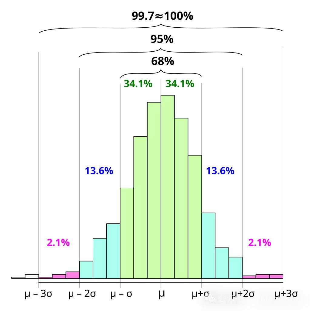 学过中学数学都知道,在正态分布 [^2] 中, 的数据位于平均值的一个标准差内, 位于两个标准差内, 位于三个标准差内,这也是著名的 68-95-99.7 Rule [^3] ,如下图 1 所示: