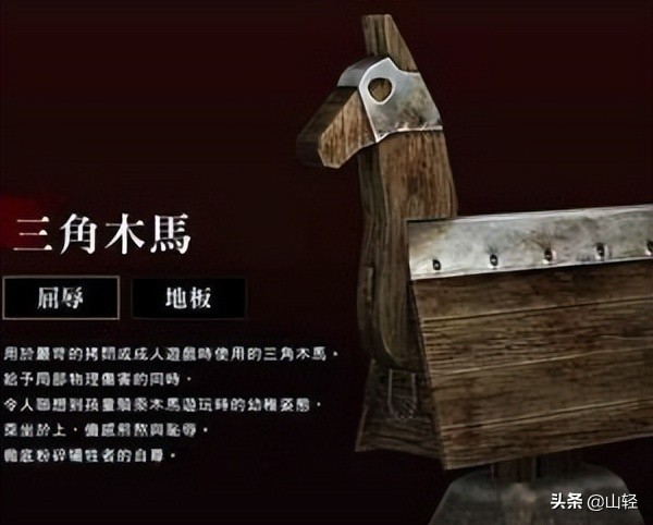三角木马是十五世纪发明出来的一种刑具,外表看上去很简单,就像是一个三角形的“椅子”,三角木马的顶端一般都是铁制的,而且顶端还可以换成大的或者换成小的,顶端越小对受刑者的折磨也就越大,而这种刑罚主要是针对女性使用的,使用时让受刑者骑坐到上面,并且还要给受刑者的脚上绑一些重物。这样会直接导致受刑者下体损坏,或者直接撕裂。现在则是将三角木马改良后当做SM道具在使用了