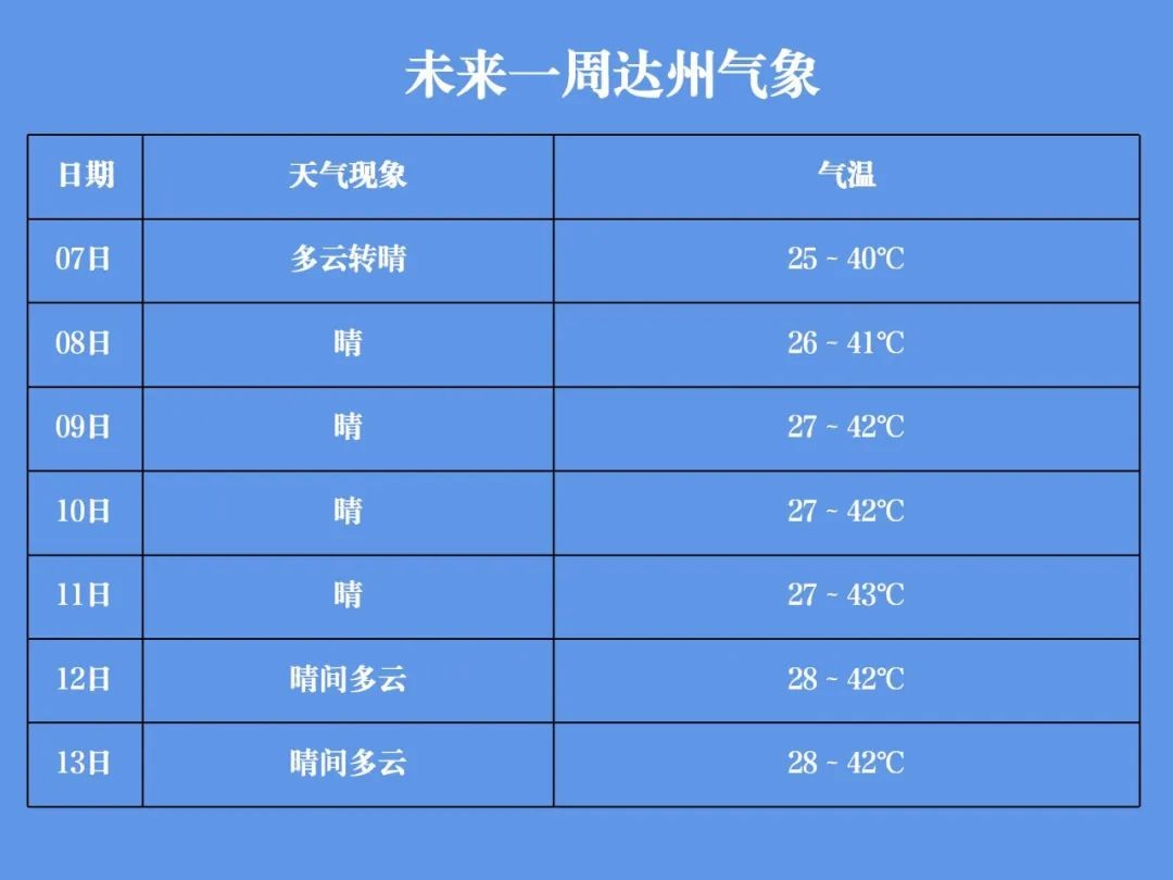 预计未来9天(7~15日),我市以高温晴热天气为主,其中7日开始中南部大部分乡镇最高气温将超过40℃,空气污染扩散气象条件2级,较利于空气污染物的稀释扩散,气温高、紫外线强臭氧浓度偏高。大竹、宣汉、万源出现伏旱风险较高,达川、开江、渠县出现伏旱风险高。