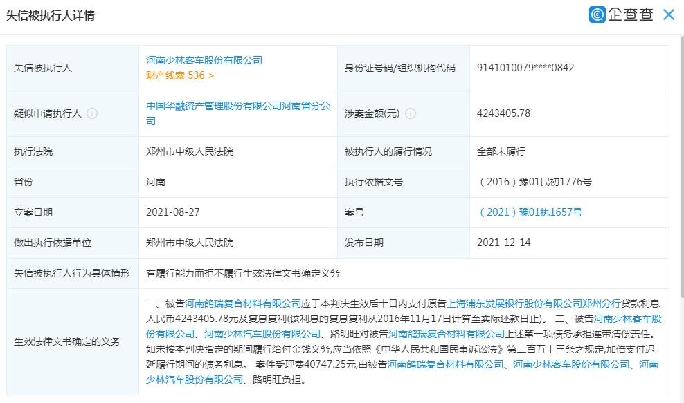 然而历史上,少林汽车曾为河南鸽瑞复合材料有限公司、河南新飘安高科股份有限公司作过融资担保,这两家公司或退市、或破产,平顶山银行、洛阳银行、信达资产等债权单位不依不饶追索债权,作为担保单位的少林汽车被列入执行人行列之后,少林客车也有可能背负巨额债务。
