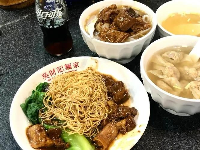 汤底是用猪骨和虾壳精心熬制而成,味道浓郁鲜美。将面条和云吞放入滚烫的汤中煮熟,再加入适量的葱花和韭黄,一碗热气腾腾的云吞面就做好了。吃的时候,先喝一口鲜美的汤,再品尝爽滑的面条和鲜嫩的云吞,让人回味无穷。人均消费在20元左右,价格实惠,是很多老广的心头好。